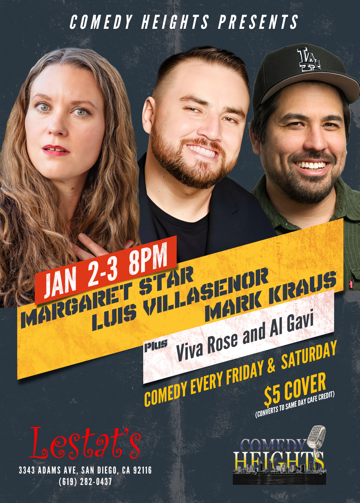 This weekend at Comedy Heights at Lestat’s on Adams Ave we bring you the hilarious Margaret Star, Luis Villasenor, Mark Kraus. Viva Rose and Al Gavi.