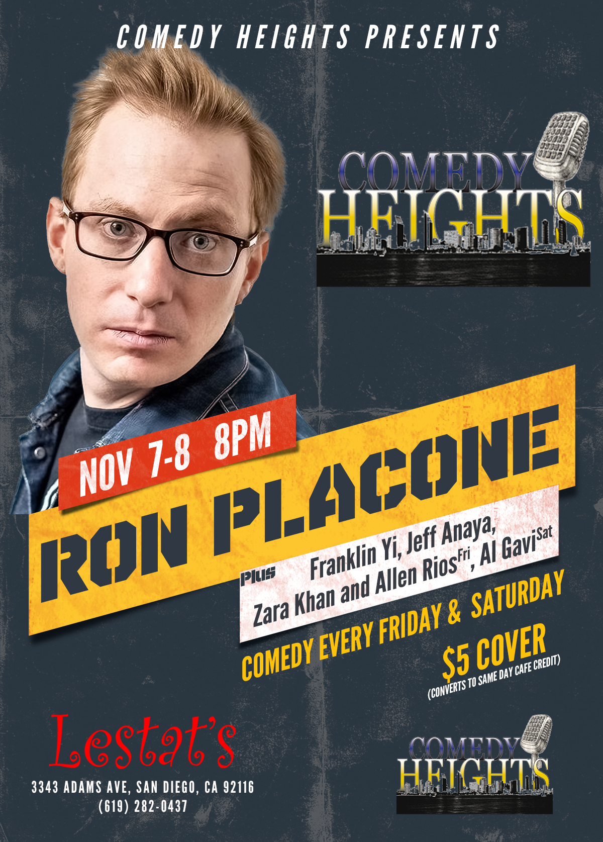 Joining Ron this weekend are Franklin Yi, Jeff Anaya, Zara Khan, Allen Rios(Fri) and Al Gavi(Sat). Show times are 8pm with the doors opening at 7:30pm. $5 cover convert to same day cafe credit.